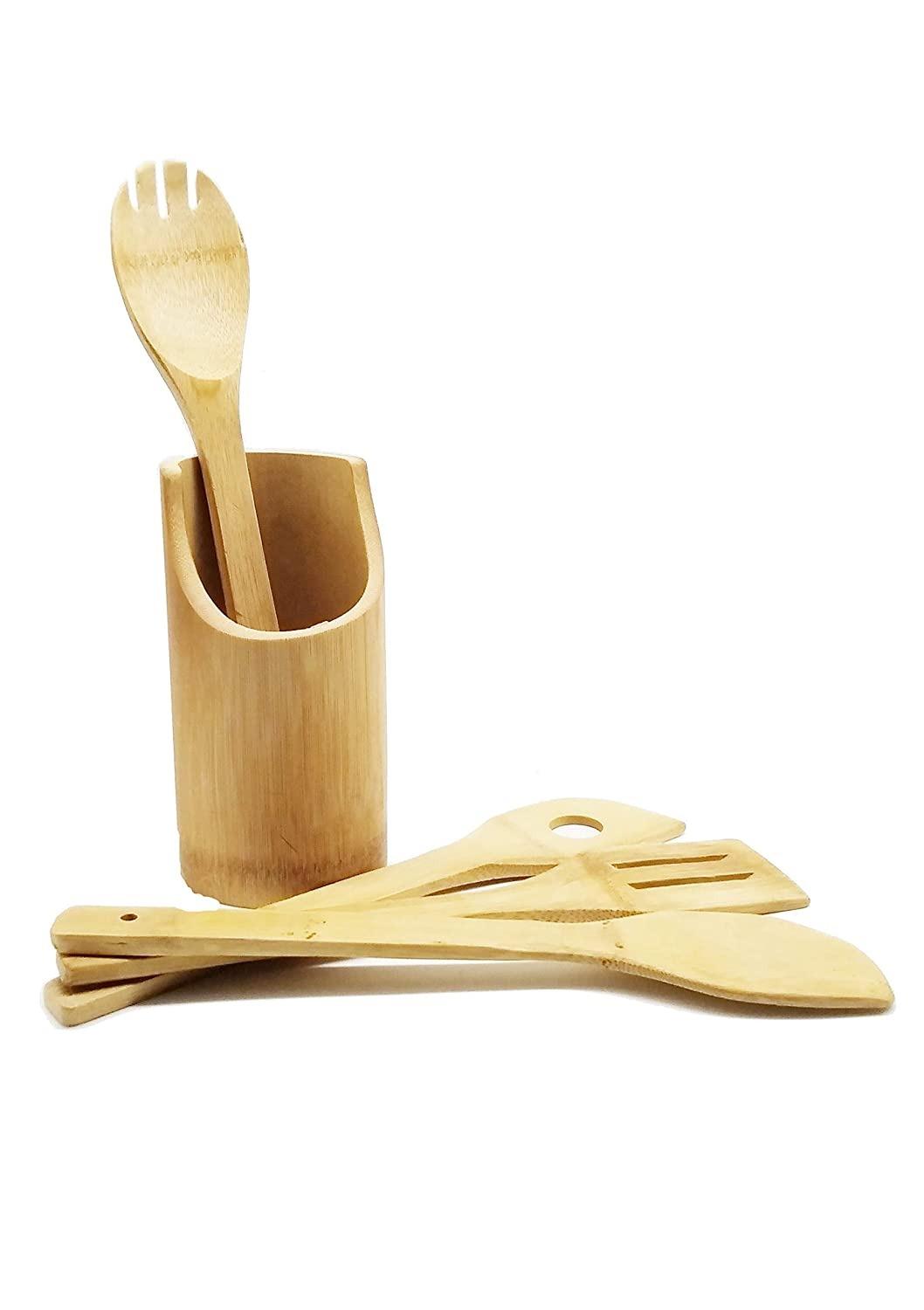 - 4 PC Set :Bamboo kitchen utensil set with 6 pieces – Solid spoon, slotted spoon, Solid spatula, Spoon Fork and a convenient holder made from a real bamboo shoot.